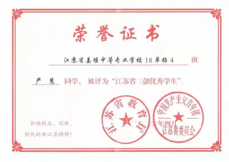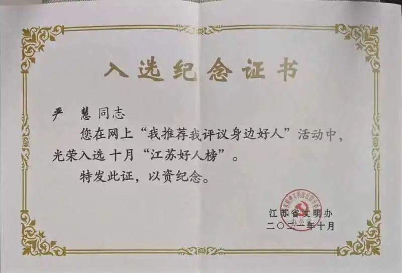 在省姜堰中專學習期間,嚴慧同學成長為一個品學兼優、誠實守信、健康向上的陽光女孩。2020年4月被評為“江蘇省三創優秀學生”;2020年11月獲“中職國家獎學金”,并作為“中職國家獎學金優秀代表”榮登2021年5月4日《人民日報》;2020年12月被評為江蘇“崇德守信”好青年;2021年9月“帶著奶奶來上學”的事跡被《人民日報》《光明日報》《央視新聞》等主流媒體的微信公眾號推送;2021年10月被評為“江蘇好人”;2022年4月被列為2022年第一季度“中國好人榜”候選人。