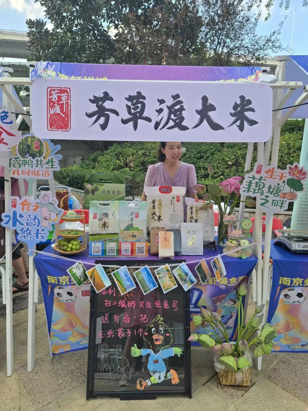 鼓樓水岸·南藝后街的外秦淮河畔,江北新區(qū)葛塘街道帶來(lái)的“尋味官塘”品牌農(nóng)產(chǎn)品在夏夜晚風(fēng)中飄散著誘人的氣息。有機(jī)蔬菜、時(shí)令水果……這些帶著泥土芬芳的“土味”,成為球迷觀賽間隙舌尖上的驚喜。