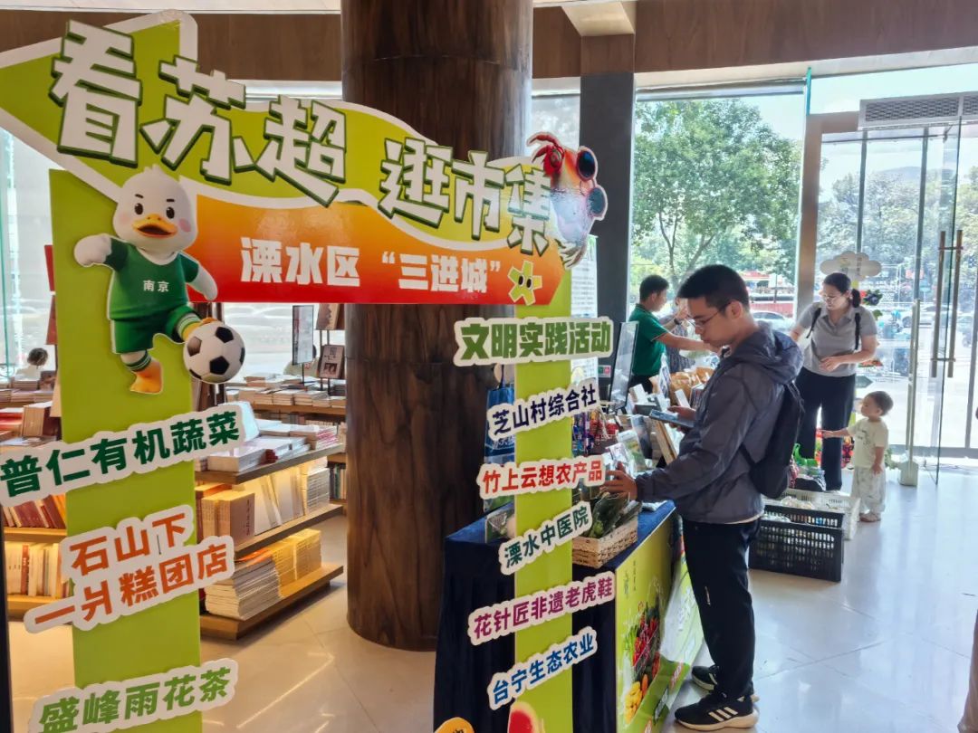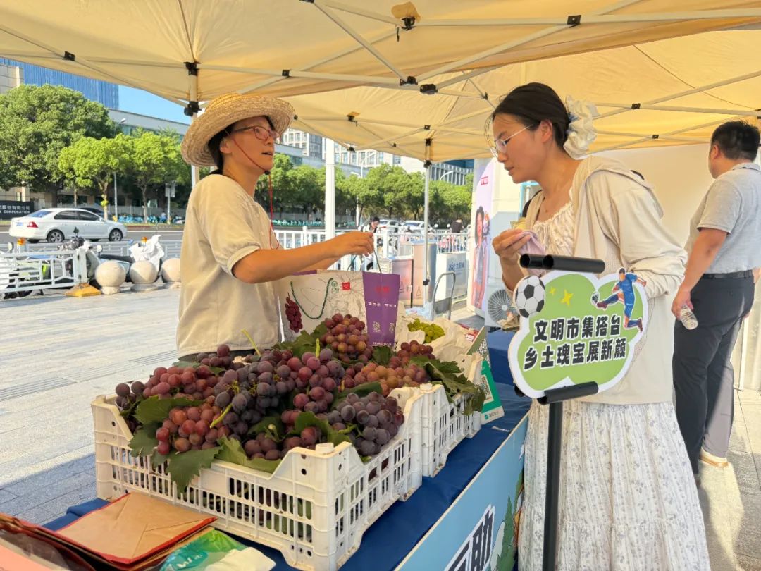 在雨花臺(tái)區(qū)虹悅城東廣場(chǎng),巨大的高清屏幕同步直播著蘇超激戰(zhàn),場(chǎng)外的“三進(jìn)城”主題市集人潮涌動(dòng)。溧水半山果蔬、富華果林等家庭農(nóng)場(chǎng)以及溧水供銷(xiāo)社的展臺(tái)被圍得水泄不通。溧水區(qū)供銷(xiāo)社合作事業(yè)科負(fù)責(zé)人郭倩介紹,來(lái)自溧水的葡萄、梨、無(wú)花果等精品水果很受歡迎,僅16日一天,首批50公斤溧水無(wú)花果便被搶購(gòu)一空,次日補(bǔ)貨的100公斤同樣迅速售罄。