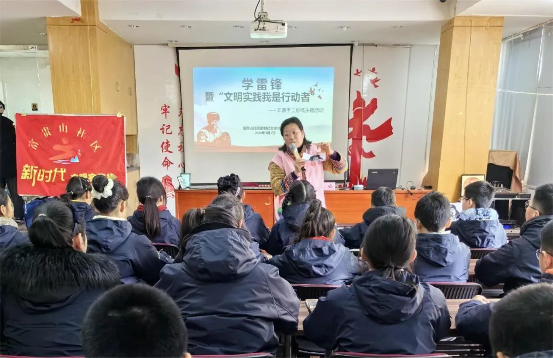 富貴山社區黨員志愿者指導海英小學學生開展手工剪紙,以非遺文化剪紙刻畫雷鋒畫像讓學生在手工實踐中牢記雷鋒精神。