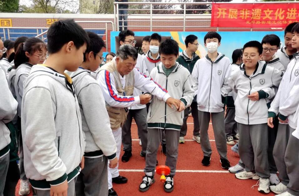 秦淮區光華路街道海福巷社區新時代文明實踐站走進南京師范大學附屬中學行知分校,開展非遺文化空竹表演進校園活動。
