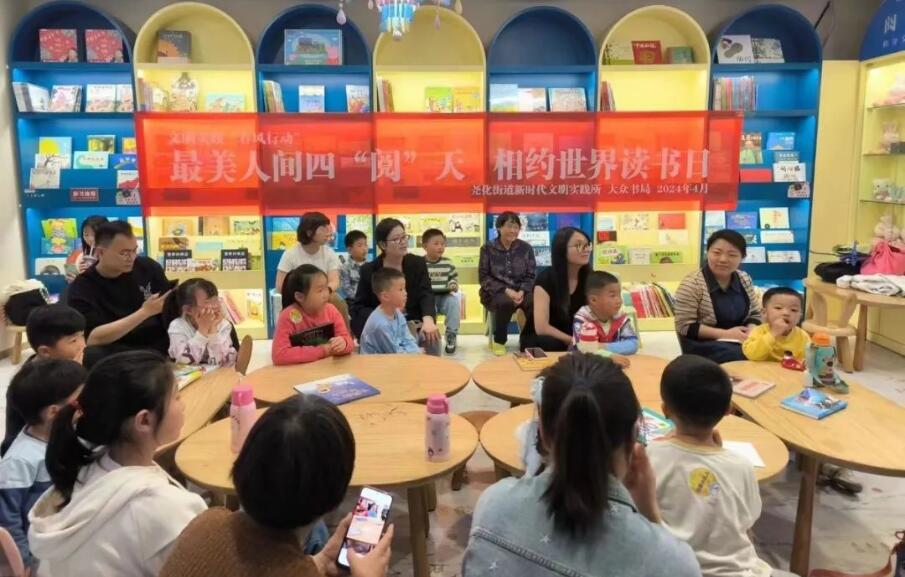 棲霞區堯化街道新時代文明實踐所聯合大眾書局金地廣場店開展“最美人間四‘閱’天 相約世界讀書日”主題閱讀推廣暨“護苗·綠書簽”主題活動。現場老師組織家長與孩子共讀親子故事繪本。