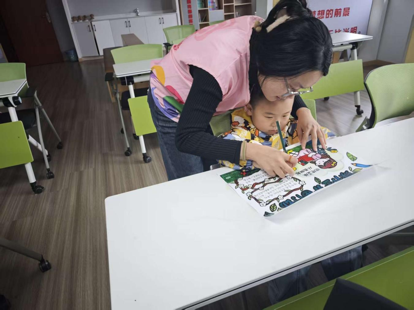 活動伊始,志愿者帶領孩子走進“四季主題閱讀”。老師朗讀《四季的歌》片段,用“迎春花的嫩黃”“荷葉的碧綠”等文字勾勒四季,孩子們踴躍分享:“夏天能聽蟬鳴吃西瓜”“秋天楓葉像小手掌”。繪畫創作環節,志愿者結合讀物講解技巧:“春用嫩綠粉紅,夏選深藍翠綠,秋取橙黃棕紅,冬擇雪白淺灰”。孩子們揮筆創作:春園蝶舞、夏塘蛙鳴等,實踐所化作創意樂園。“讀了《四季的故事》,我畫了一棵樹的四季。”鄭旭辰興奮展示作品。家長張女士點贊:“閱讀加繪畫,既養習慣又提創意。”