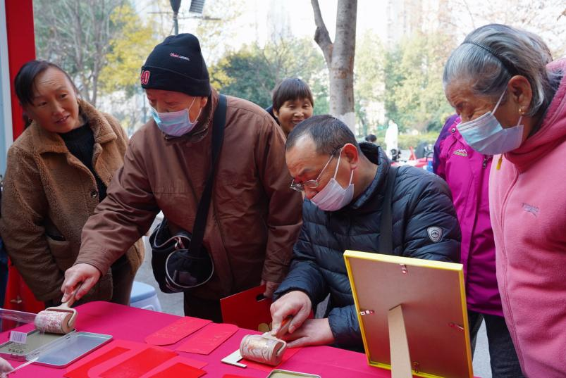 縫補(bǔ)衣物的師傅指尖翻飛,短短十幾分鐘就為居民修補(bǔ)好了破損的衣物,解決了大家“小修小補(bǔ)難”的困擾;元旦知識(shí)問答攤位前排起長(zhǎng)隊(duì),“公歷元旦是每年的哪一天?”“貼福字倒貼的寓意是什么?”男女老少紛紛舉手,踴躍參與;書法愛好者現(xiàn)場(chǎng)揮毫潑墨,筆走龍蛇間,一幅幅帶著墨香的春聯(lián)、一個(gè)個(gè)遒勁有力的“福”字新鮮出爐,為社區(qū)增添了濃濃的年味兒;小朋友們拿起工具,將馬年吉祥圖案拓印在一封封紅包上,在動(dòng)手實(shí)踐中感受非遺傳統(tǒng)文化的獨(dú)特魅力。