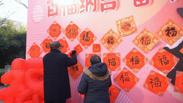 活動一開場,“百福共繪·吉墻生輝”簽到區就被居民圍得水泄不通。紅彤彤的主題背景墻上,“福滿奮斗”藝術字樣與祥云、瑞龍紋樣相映成趣,周邊預留的空白區域正等待居民們的創意填充。長桌前,毛筆、墨汁、紅色灑金宣紙整齊擺放,居民們紛紛執筆,揮毫潑墨寫下楷、隸、行、篆各式福字,并在“福”字旁簽下名字或寫下“健康”“團圓”“奮斗”等寄語,再親手將作品粘貼到背景墻上。隨著一個個形態各異的福字匯聚,一幅獨一無二的“社區百福圖”逐漸成型,既藏著書法藝術的文化韻味,又飽含鄰里團圓的溫情。