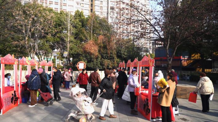 “奮斗菜場”作為活動的核心陣地,年味十足。篩選出的優質商戶在攤位貼滿福字貼紙,新鮮果蔬、南北干貨、傳統糕點、自制醬貨擺得滿滿當當,儼然一個“迷你年貨鋪”。“菜場尋福記”更讓采購增添了樂趣。居民逛菜場時,在肉類區、水產區等指定攤位,購買帶福字貼紙的年貨,就能到社區廣場服務臺兌換定制春聯或新年掛件。“買斤帶魚還能領福禮,太貼心了!”剛兌換完紀念品的王阿姨笑著說,買菜順帶“撿福氣”,輕松又暖心。