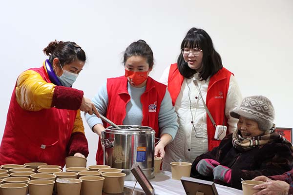 與此同時,廚房里粥香漸濃。志愿者們提前精心準備,將糯米、紅豆、紅棗、蓮子、桂圓等十余種食材細心熬煮,制成香甜軟糯的臘八粥。隨著熱氣騰騰的粥碗被端到每一位長者手中,溫暖也從指尖蔓延至心間。大家細細品味,笑意盈面。