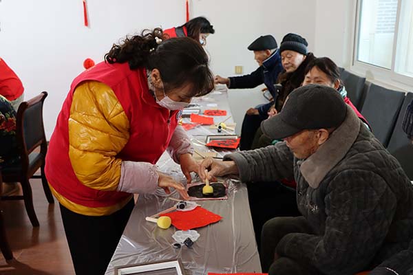 在隨后的新春福字拓印手工環節,現場充滿了歡聲笑語。在志愿者的耐心協助下,長者們親手鋪紙、蘸墨、按壓,一幅幅寓意吉祥的“福”字與喜慶圖案逐漸清晰地呈現在紅紙上。看著自己親手完成的作品,長者們高興地互相展示,并將這份承載著祝福的“福”氣帶回房間,也寄托了對新春佳節的美好期盼。