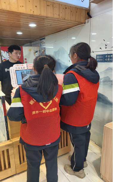 活動現場,青少年志愿者們走上街頭,熱情的向商戶宣傳消防安全知識。在分龍崗西路,在社區“老張下午茶”服務品牌志愿者的帶領下,追“鋒”少年們手握《消防安全倡議書》,帶著滿滿的真誠和責任,冒雨一戶戶上門宣傳,“叔叔,安全大于天!經營的時候也要注意安全,不能在消防通道堆放雜物,更不能飛線充電!”“阿姨,將電動車放在店內充電是非常不安全的,您忙起來也容易忘掉及時斷電,所以請一定要注意安全,規范充電”同學們一邊把倡議書遞給商家,一邊不忘認真叮囑。經過一個多小時的走訪,商戶們均收到了來自孩子們的“善意”。
