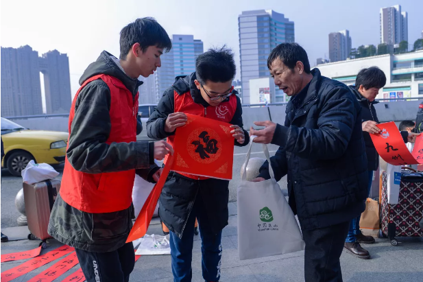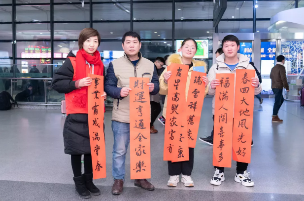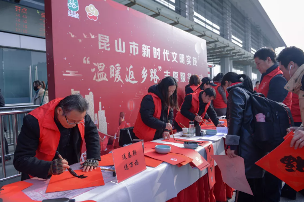 鼠為生肖首,春乃歲時先。春節即將來臨,帶著對故土、對親人的眷戀,千千萬萬在外奮斗的務工人員踏上了返鄉路。他們是美麗城市的創造者、見證者、奉獻者,城市的每一個進步和他們的付出都密不可分。1月19日,由昆山市委宣傳部、市文明辦、市志愿者總會、昆山火車站、高鐵昆山南站、市義工聯合會組織開展的新時代文明實踐“溫暖返鄉路”志愿服務活動,在火車站、高鐵站同時開展,給返鄉的“同城伙伴”送去新春的問候。久違的太陽和現場火熱的氣氛讓整個活動暖意滿滿。春聯表示辭舊迎新,寄托著人們的美好愿望。當書法志愿者拿出筆墨紙硯時,就吸引了很多旅客,他們爭相選取著自己中意的對聯。“請幫忙寫這個,我要送給我奶奶。”“我想要這個橫批,可以幫我寫一下嗎?我老爸老媽肯定喜歡。”