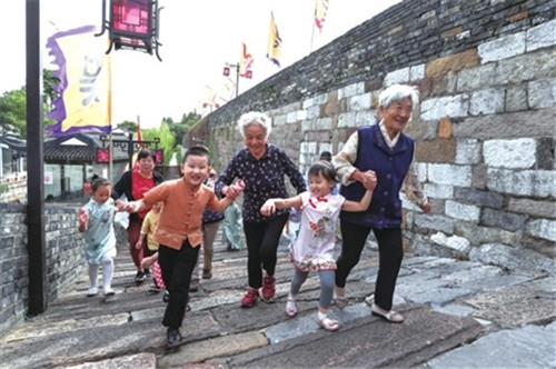 據(jù)了解,當(dāng)天15名轄區(qū)老居民、退役軍人、退休職工和穿著各種傳統(tǒng)服飾的幼兒園小朋友,從健身步道出發(fā),經(jīng)過光裕里廣場,沿步梯登高到達(dá)水陸盤門城樓。一路上,孩子們歡呼雀躍,聽老人講述古城墻的故事。“奶奶,老師說重陽節(jié)是你的節(jié)日,我要在高樓上祝你節(jié)日快樂哦!”來自紅旗幼兒園的11名小朋友和轄區(qū)老人們手牽手在環(huán)古城河邊的健身步道上有序前行。到達(dá)水陸盤門城樓后,孩子們還給在場的老人表演了蘇州話童謠,送上重陽節(jié)的別樣祝福。