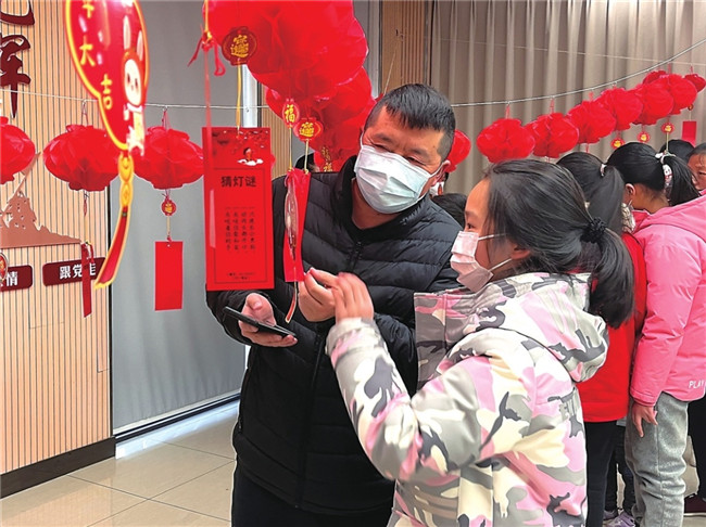 一盞盞紅紅的燈籠高高掛起,承載著人們美好的愿望,更希望未來的日子紅紅火火、鴻運當頭。在大紅色的燈籠下面,系著一張張隨風搖曳的燈謎。小朋友們將猜出來的燈謎記在心里,用這張燈謎結(jié)果換到了一支可愛的筆,開心地把這份成果揣進兜里。家長們也仿佛回到了兒時,讀著燈籠下面一個個有趣的問題紛紛笑開了懷。