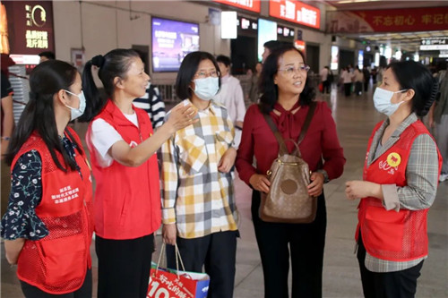 在蘇州火車站,姑蘇區文明實踐志愿者們往來游客提供咨詢、指引、搬運行李等志愿服務,協助維護假日期間蘇州火車站區域秩序,在火車站這個城市窗口展示了蘇州文明城市形象。