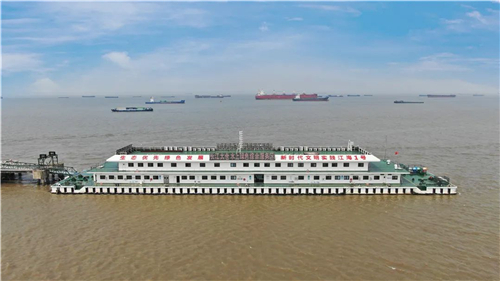 太倉海事局水上綠色綜合服務區,是目前長江單體設施最大綜合躉船,總長110米,位于太倉港集裝箱碼頭片區下游。