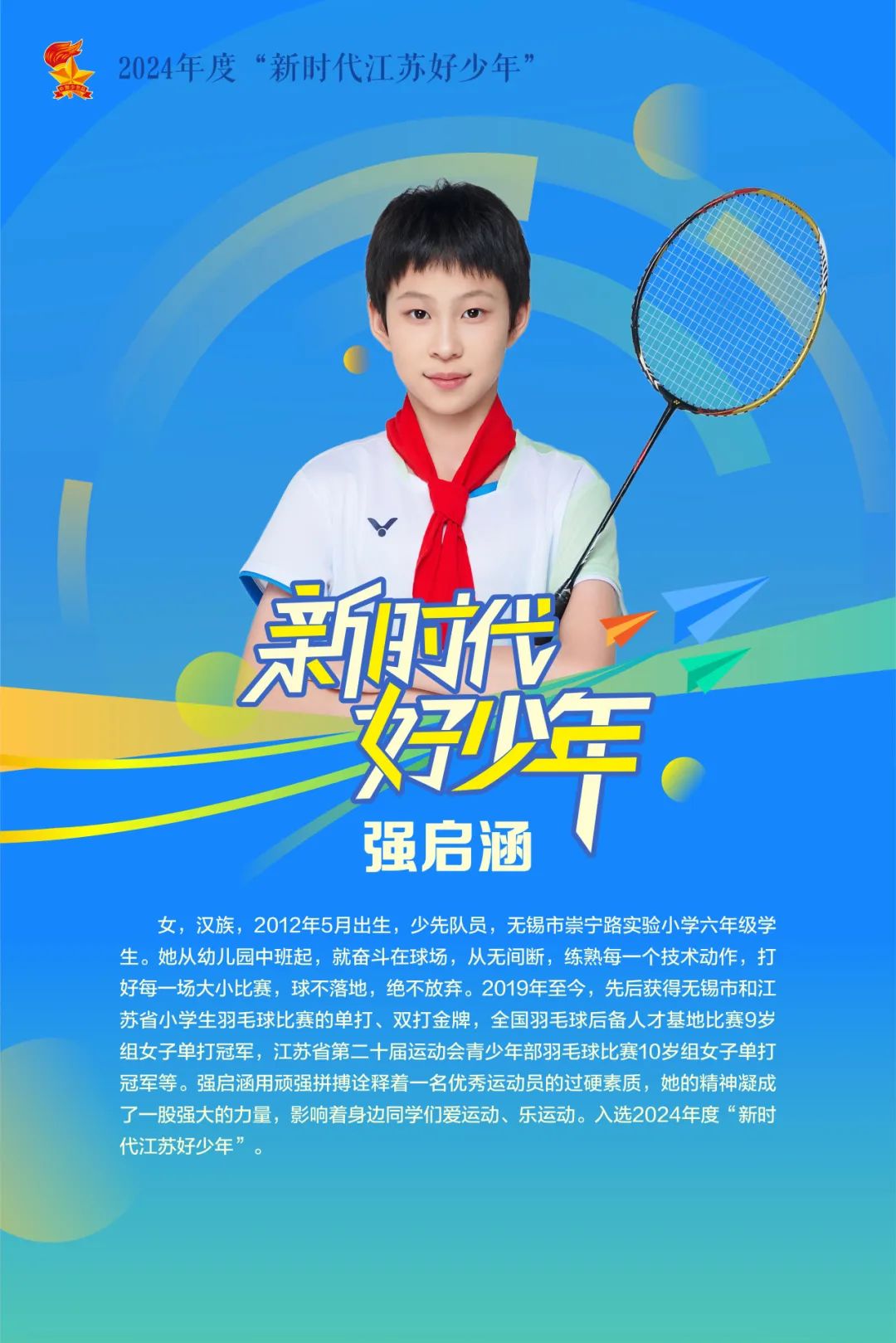 根據中央精神文明建設辦公室、教育部、團中央、全國婦聯、中國關工委等5部門《關于開展2024年“新時代好少年”學習宣傳活動的通知》要求,江蘇省精神文明建設辦公室經廣泛發動、逐級推薦、實地走訪、集中評審、集體評議等程序,無錫市共有強啟涵、徐鳴、葉文韜、華淑妍4名同學入選2024年度“新時代江蘇好少年”。