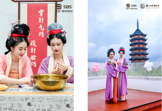 七夕節包含著豐富的民俗文化內容,與蘇州織造技藝、染織紋樣、蠶桑文化有著千絲萬縷的聯系。在七夕節到來之際,蘇州絲綢博物館與蘇州廣電聯合打造“錦繡‘莨’緣”絲博七夕文化周,傳承和弘揚江南絲綢文化,推進婚嫁移風易俗,共同打造蘇州甜蜜人文經濟。