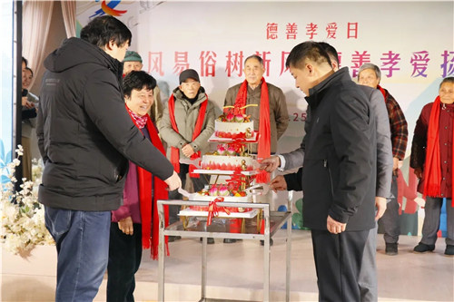 當天還要把80歲的老人請上臺,送禮物,拍照,切蛋糕,吃蛋糕。村里原本有風氣,老人到了80歲,如果家中小輩不給辦壽宴,不孝。而自從有了“德善孝愛日”上的壽宴,誰還在乎小輩給不給自己過壽?整個村都記得,今年誰上了臺,明年又輪到誰上臺。老人們需要的是記得和在乎,“孝愛”兩個字被表達得淋漓盡致。