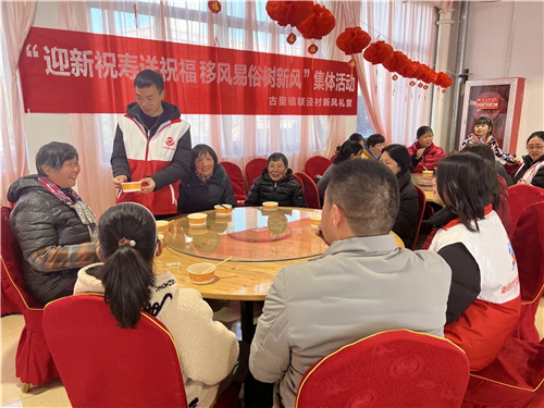 ▲古里鎮聯涇村在新風禮堂舉辦集體祝壽活動。