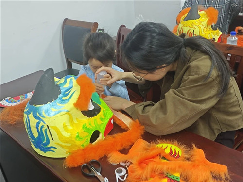 經過五天自然風干,今天將進行粘毛這一關鍵工序。活動現場,親子家庭紛紛拿起工具,仔細涂抹膠水,并小心翼翼地為龍獅貼上各色裝飾,氣氛熱烈而溫馨。