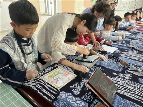 在體驗(yàn)環(huán)節(jié),實(shí)踐站志愿者精心準(zhǔn)備了刻好圖案的木板、鮮艷的顏料和柔軟的紙張。在工作人員的耐心指導(dǎo)下,孩子們紛紛化身“小工匠”,開啟了年畫創(chuàng)作之旅,他們用小手輕輕按壓、撫平,然后一點(diǎn)一點(diǎn)地揭開紙張。當(dāng)一幅幅色彩斑斕、充滿童趣的年畫呈現(xiàn)在眼前時(shí),孩子們興奮得歡呼起來:“快看,我印出年畫啦!”“我印的胖娃娃好可愛!”
