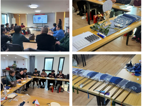 活動伊始,來自音品堂的專業指導老師系統介紹了非遺土布“扎花紡線”的細膩工藝、“植物染”的自然韻律以及“傳統紋樣織造”的匠心巧思。在扇面制作體驗環節,十余位手作愛好者在老師的悉心指導下,親手進行土布的挑選、裁剪與拼接。一針一線中,大家相互交流配色心得,分享制作技巧,現場氣氛熱烈。最終,一塊塊紋理獨特的土布,在大家的巧手下化身為一把把充滿巧思的扇面。