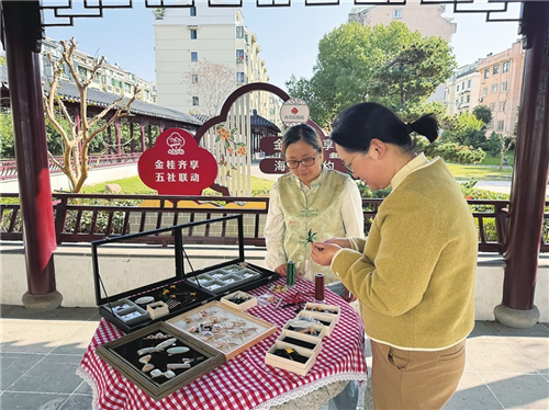 敏銳捕捉到這份向善力量與需求,桂花社區黨委打造“‘飾’放光彩”手工首飾創作募集項目,在社區婦聯帶領下,以傳統宋錦非遺技藝為紐帶,成立“桂香姐妹花鈿絲語手作工坊”,為全職媽媽搭建起技能實踐與志愿服務相輔相成的平臺。