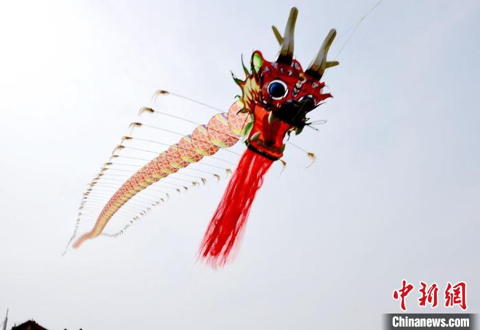 一條20米長(zhǎng)的祥龍風(fēng)箏在絲線的牽引下,迎風(fēng)飛舞,氣勢(shì)恢宏。朱志庚 攝