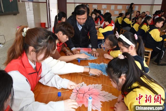 “把紙質(zhì)楓葉沿著中縫對(duì)稱折疊,然后將最上面的葉尖沿著梗線橫向折疊……”北辰小學(xué)一間教室里,市級(jí)非遺項(xiàng)目“徐州風(fēng)箏”代表性傳承人曹開(kāi)君現(xiàn)場(chǎng)教學(xué)生們制作風(fēng)箏。來(lái)自江蘇建筑職業(yè)技術(shù)學(xué)院的30余名大學(xué)生志愿者與北辰小學(xué)的30余名學(xué)生,結(jié)對(duì)協(xié)作,一起學(xué)習(xí)風(fēng)箏制作。