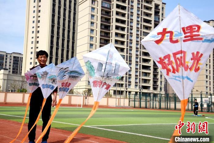 操場(chǎng)上,鼓樓區(qū)九里街道九里新苑社區(qū)非遺志愿者們將各種造型、大小不一的風(fēng)箏擺放出來(lái),進(jìn)行展示。這里的風(fēng)箏大都是非遺傳承人提前做好的,最小的是比手掌還小的袖珍風(fēng)箏,最大的是龍形風(fēng)箏,契合了今年龍年的主題。