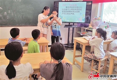 “同學們,你們知道這張卡片上的表情表達的是什么心情嗎?”同學們大聲說:“她在笑。”“那么,笑是一種什么情緒呢?”“老師,笑是高興的情緒。”“很好”,那還可以用什么詞語來形容呢?“還可以說是開心、愉快。”“非常好。”……近日,在徐州賈汪區大吳街道湖里社區愛心暑托班,區人大代表、大吳中學教師殷小偉帶著孩子們用身體語言、肢體語言,表達著卡片上的內容,課堂里充滿了歡聲笑語。