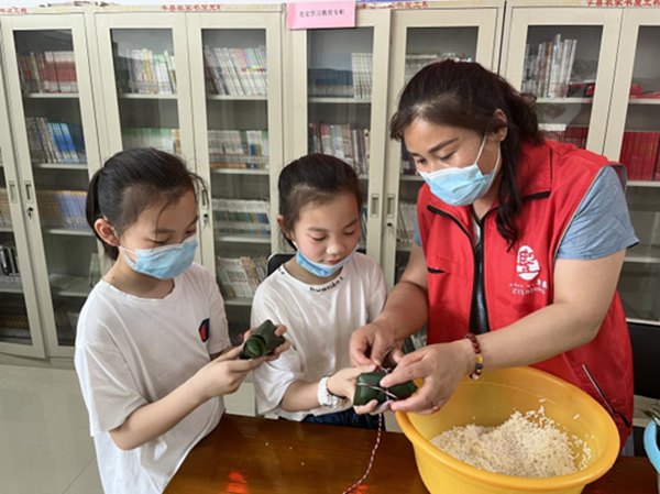 在另一個活動室,黨員志愿者們正和居民群眾、青少年兒童一同包粽子,體驗端午節(jié)傳統(tǒng)文化。“路漫漫其修遠(yuǎn)兮,吾將上下而求索……”大家邊包粽子邊誦讀著《楚辭》經(jīng)典名句。一時間粽葉舞動,麻繩穿梭,捋粽葉、填糯米、壓緊實、封口、扎繩,一個個精致的粽子就包好了。