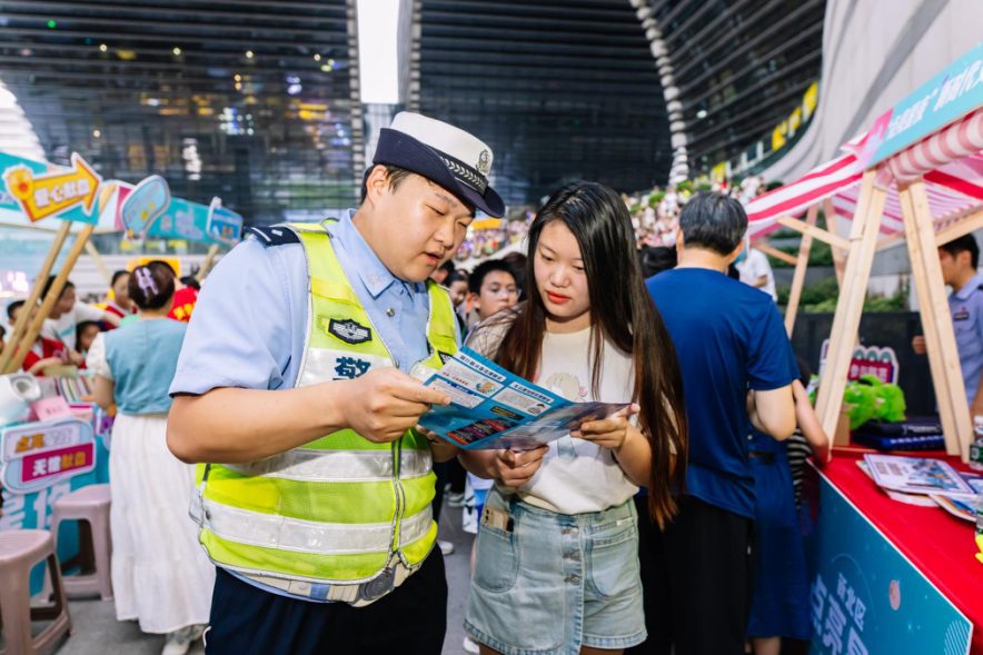 演出間隙,理論、反詐、交通安全、全民閱讀等問答知識,寓教于樂,市民們熱情參與踴躍回答。舞臺旁,“文明集市”人潮洶涌,交警、公安、郵政、醫院等攤位為市民提供公益服務。一張“點亮星夜”明信片,通過“理響郵局”,寄給未來的自己;一碗夏日養生茶,迎接高溫天氣;一份反詐宣傳折頁,化身反詐鎧甲守護群眾財產……