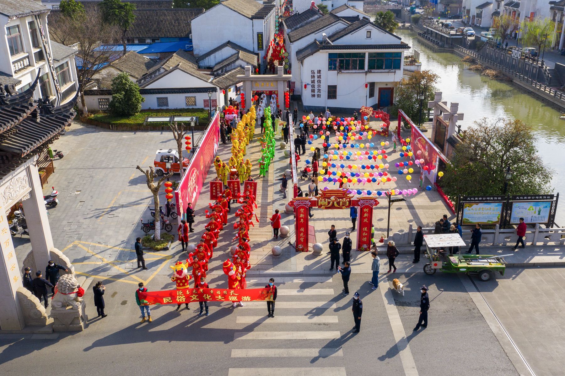 由歡樂腰鼓隊、喜慶鑼鼓隊、雙龍騰飛隊、紅燈高照隊、錫劇隊、秧歌隊、東舜蓮韻隊、娃娃樂隊、花籃隊、蚌殼龍船隊組成的長涇鎮民俗文化大巡游隊伍,沿著老街一路巡游,展示長涇特色民俗文化。現場鑼鼓喧天,載歌載舞的巡游長龍吸引了眾多居民跟隨觀看。