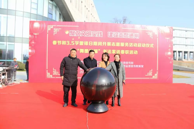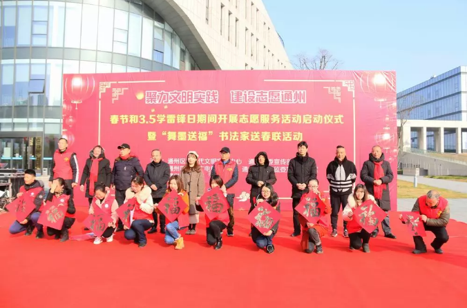 1月19日上午,通州區文博中心南廣場喜氣洋洋,熱鬧非凡。區新時代文明實踐中心與文廣旅局主辦的春節和3.5學雷鋒日期間開展志愿服務活動啟動儀式暨“舞墨送福”書法家送春聯活動正如火如荼地舉行。區文明辦副主任進行了活動致辭,文廣旅局分管領導向文化志愿者書法家代表授“春節和3.5學雷鋒日期間開展志愿服務”先鋒隊隊旗,全體志愿者代表一起宣讀了志愿者誓詞。