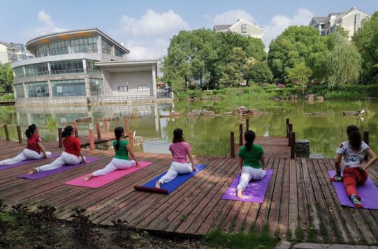 19日上午7時30分許,市區蘇建花園城人工湖畔流淌著時尚運動的氣息:沈曉村和她的學生顏菊、龔伶娜出現在近水平臺,開始練習瑜伽,為6月底即將舉行的慶祝建黨99周年演出作準備。