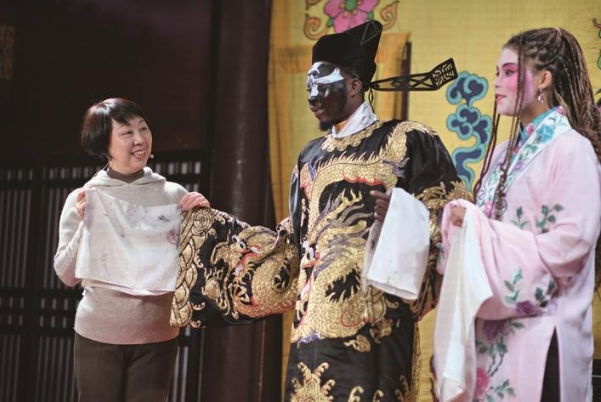 講解結束,留學生們輪流上臺,在演員們手把手的指導下,試穿華美的花旦服裝、戴上“包公”的髯口、掄一把“孫悟空”的如意金箍棒。大家興奮地交流拍照,上傳社交平臺,還有的直接和家人視頻連線,分享新奇和喜悅。