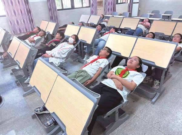 在寬敞整潔的多功能教室里,學生劉奕凱和小伙伴們依次鋪好墊子,脫下涼鞋放在墻邊,挨個兒躺下來蓋上了被子。“手腳都能伸直,就像在幼兒園里一樣,感覺非常舒服。”不一會兒,劉奕凱就進入了夢鄉(xiāng)。
