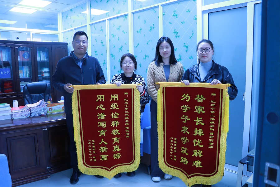 2025年11月12日下午,啟東市匯龍小學二年級5班學生家長顧海霞醫生夫婦專程來到匯小,將寫有“用愛詮釋教育真諦,用心譜寫育人新篇”“替家長排憂解難,為學子求學筑路”的錦旗,分別贈予數學教師兼班主任陸鏈、語文教師蔣莉莉,表達對兩位老師在孩子學習和生活上無微不至關懷的誠摯謝意。