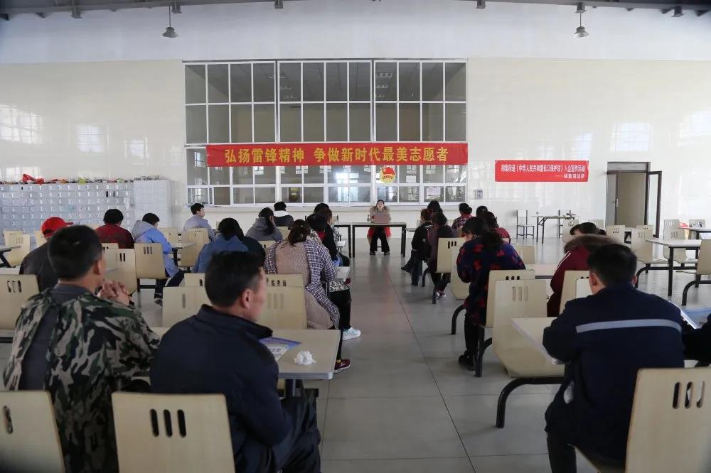 在江蘇峻昌科技有限公司食堂,律師志愿者馮靜波給公司職工打開話匣子:“為了讓陜西略陽的職工能聽得懂,今天我用普通話跟大家講講《民法典》。我先從身邊的一個案例說起吧……”她結合身邊案例,向大家講解了《民法典》婚姻家庭編有關內容,回答了大家的疑問。普法宣傳志愿者們深入車間,向工人發放并宣傳《民法典》《長江保護法》等法律法規。