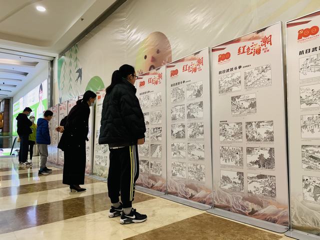 展覽由《革命風潮》《抗日怒潮》《解放熱潮》三部分組成,每一張圖片皆配有具體文字講述海門老區故事,用畫筆形象地描述海門老區人民從站起來、富起來,到強起來偉大飛躍過程,帶領市民在觀展的過程中共同去感受、學習、銘記海門人民在中國共產黨領導下浴血奮戰、艱苦奮斗的歷史足跡以及海門人民感天動地、氣壯山河的革命斗爭精神。