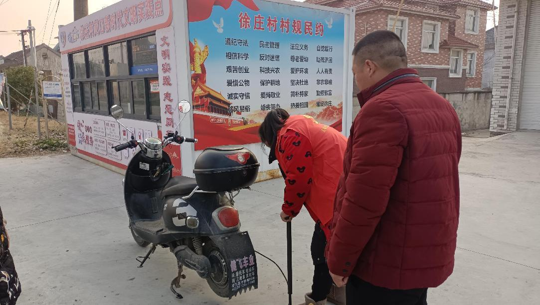 徐莊村文明實(shí)踐點(diǎn)中除了修車工具外還有雨傘、藥箱,等其他便民工具,為村民生產(chǎn)生活帶來便利。2024年3月4日早上,徐莊村村民陳師傅在日常騎電動(dòng)車上班中,車胎突兀地發(fā)出刺耳的摩擦聲,電動(dòng)車搖擺了兩下后陷入了“癱瘓”,這可急壞了要趕去上班的陳師傅。路邊聽到聲響的村志愿者,立馬招呼他并幫他推車到最近的文明實(shí)踐點(diǎn)拿取修車工具。經(jīng)過一番換胎打氣后,電動(dòng)車重新煥發(fā)生機(jī),愁容也在陳師傅臉上轉(zhuǎn)為笑容。