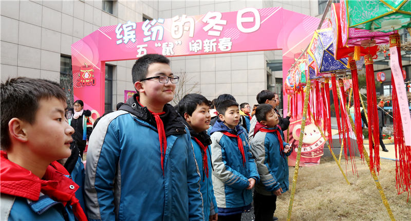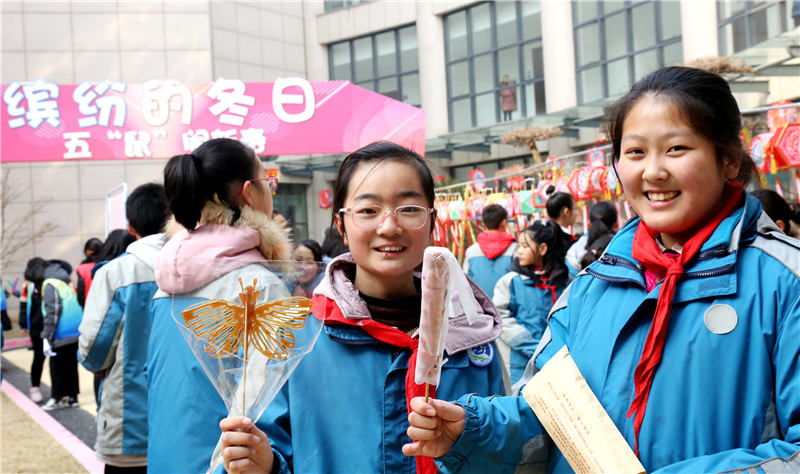 寫滿了燈謎的小紙條掛滿了一樓內(nèi)庭,原來這里正在進(jìn)行“五鼠鬧新春”猜燈謎送祝福活動(dòng),同學(xué)們積極踴躍,或冥思苦想,或激烈討論,現(xiàn)場氣氛熱烈。猜中燈謎的學(xué)生有的領(lǐng)到了糖人、有的拿著面人、還有的正吃著獎(jiǎng)品糖葫蘆,洋溢在他們臉上的笑容真是燦爛。