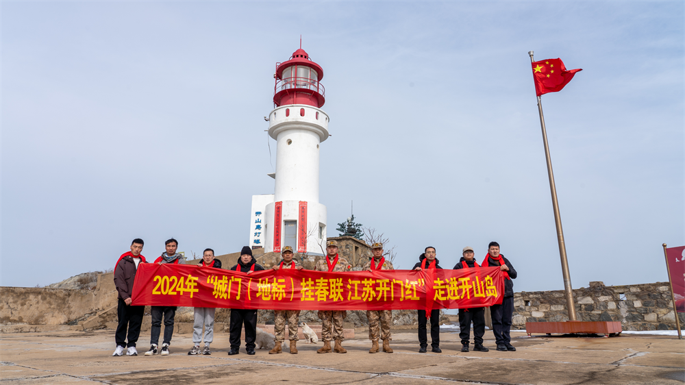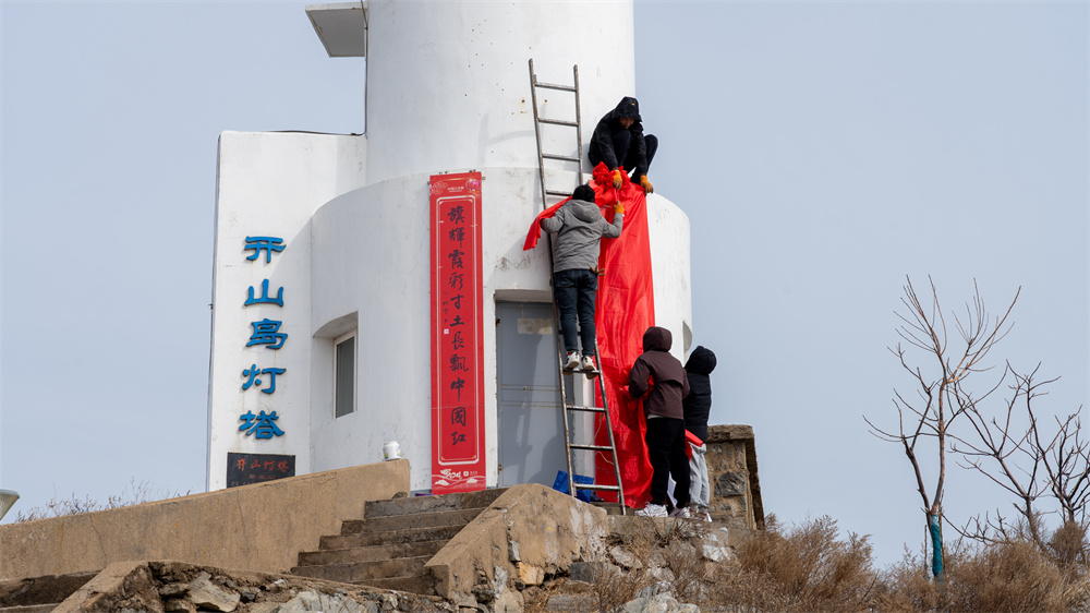與各地在人流密集的古城門或商業街區掛春聯不同,灌云縣選擇在距離陸地12公里,面積僅0.013平方公里的開山島掛春聯,迎新春,盡管少了市民和游客圍觀和駐足打卡的熱鬧,卻多了幾分莊嚴和隆重。