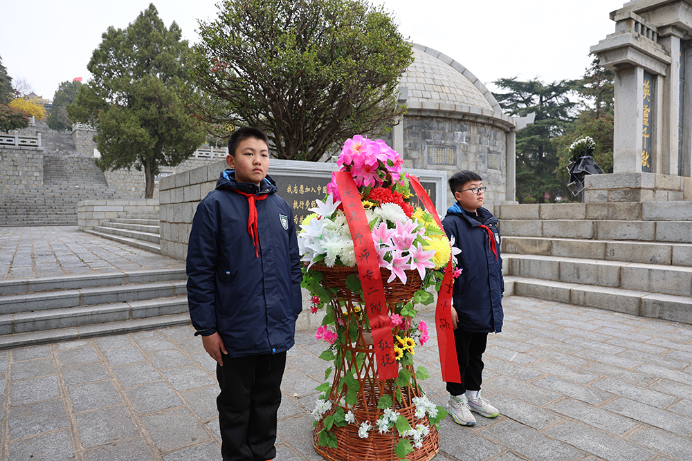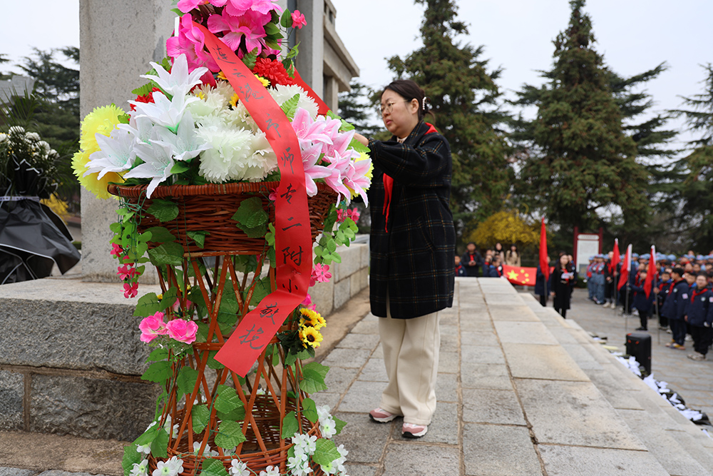 鮮花朵朵,祭奠英魂。學(xué)校黨總支副書記、校長胡蕓代表學(xué)校黨總支敬獻(xiàn)花籃,整理挽聯(lián)。全體師生向革命烈士紀(jì)念碑行三鞠躬禮,表達(dá)對烈士的崇高敬意。