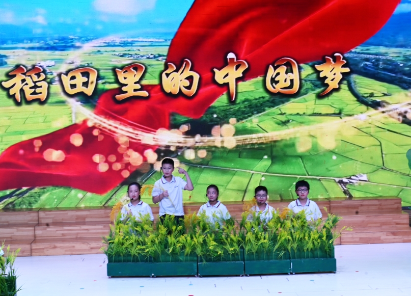一年級學生呈現的英語童話劇《Launch. Go to space》,將語言學習與太空探索主題相結合,展現出國際化視野;五六年級學生的朗誦《稻田里的中國夢》,以袁隆平院士的事跡為核心,傳遞“珍惜糧食、胸懷家國”的理念,引發全場共鳴;最后,四年級學生的合唱《唱響未來》響起,全體演員登臺合唱,用歌聲表達對未來的憧憬,演出在溫馨和諧的氛圍中落幕。
