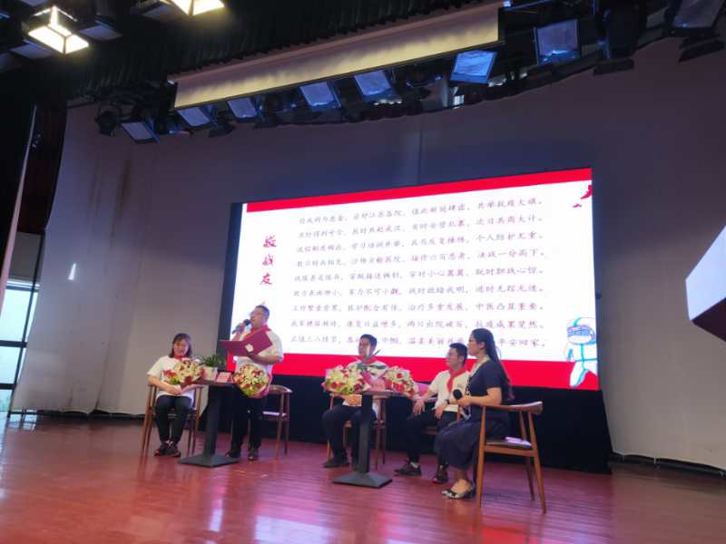 活動中,四位抗疫英雄與孩子們進(jìn)行了面對面的交流。沈麗麗,重癥醫(yī)學(xué)科省級危重癥專科護(hù)士、主管護(hù)師。她的丈夫也是二小裕豐的骨干教師,現(xiàn)場他們分享了請命奔赴抗疫前線時(shí)的義無反顧。居香名,一名年輕的90后醫(yī)師。他表示:面對洪水猛獸般的病毒,作為醫(yī)護(hù)人員,有一種職業(yè)精神驅(qū)使著我們向前去戰(zhàn)勝這個困難。陳旭,心血管內(nèi)科科室骨干。他對第一天上班的情景還記憶猶新、歷歷在目。他們按照平時(shí)訓(xùn)練那樣穿工作服,更換洗手衣、工作鞋,戴上N95口罩、外科口罩,接著穿鞋套、防護(hù)服、隔離衣、護(hù)目鏡……李紅苗,縣院副主任醫(yī)。他現(xiàn)場朗誦了原創(chuàng)詩歌《敬戰(zhàn)友》,質(zhì)樸的語言抒發(fā)的是抗疫的決心和堅(jiān)強(qiáng)的信念!他對同學(xué)們說:“少年強(qiáng)則國強(qiáng)!我希望你們從小要有擔(dān)當(dāng)?shù)囊庾R,從小樹立起遠(yuǎn)大的志向,珍惜時(shí)間、好好學(xué)習(xí),將來一定能夠?yàn)樽鎳陌l(fā)展貢獻(xiàn)自己的一份力量!”