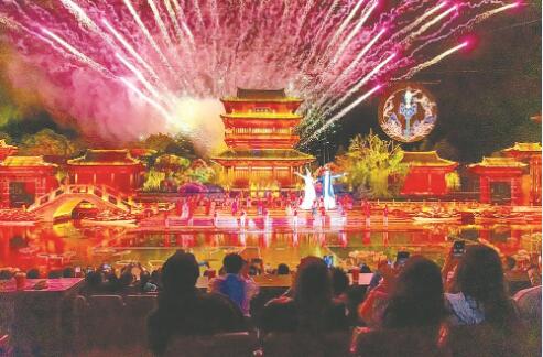 夜幕降臨,音樂響起;光影交錯,如夢似幻。摹云閣前云霧繚繞,一汪池水流光溢彩,仙女們乘著七彩祥云落入凡塵。《天仙緣》的每一處細節、每一幕畫面,都深深吸引著市民游客,他們頻頻舉起手機,拍照攝影,掌聲、笑聲、喝彩聲不斷在劇場里響起。來此觀賞的趙先生激動不已,他告訴記者:“太精彩了!我很喜歡今天的表演,能欣賞到這樣的表演真的很棒!”