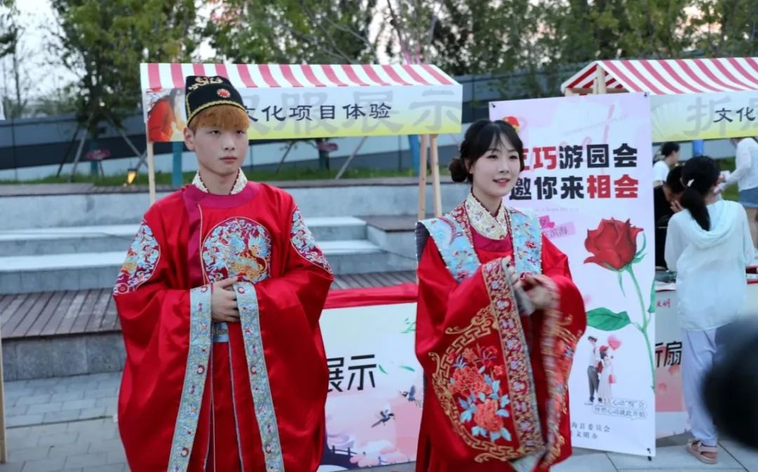 本次活動將七夕傳統文化元素融入非遺文化特色,設置了精彩豐富的“乞巧游園”體驗區,并通過“撫古追昔”“舉案齊眉”“攜手同心”三個篇章的文藝演出講述七夕故事,讓群眾在互動式參與、沉浸式體驗中感受七夕氛圍、了解節日習俗、領悟文化內涵,進一步深化文化認同。