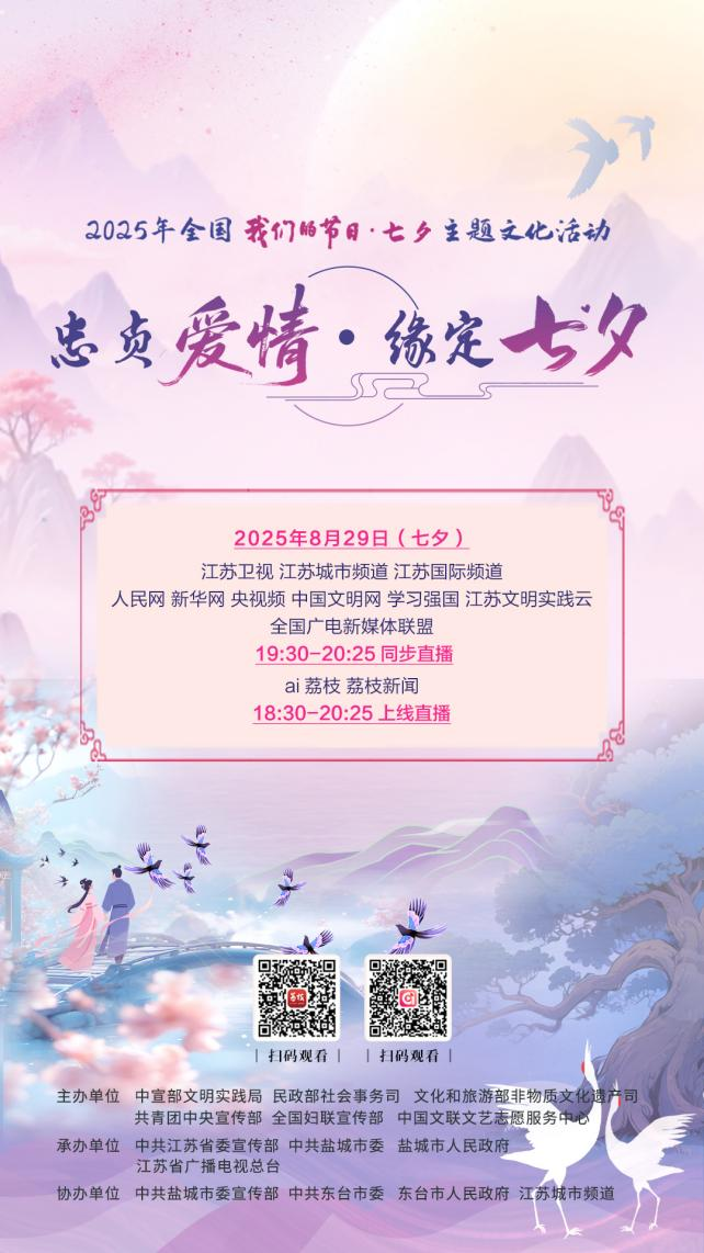 全國主場活動將融合古今元素與科技手段,通過詩樂朗誦、情境舞蹈、戲曲新唱、光影歌曲等多元節目,勾勒七夕浪漫意境,營造“穿越千年”的視聽文化盛宴。本次活動將通過江蘇衛視、江蘇城市頻道、江蘇國際頻道,以及人民網、新華網、央視頻、中國文明網、學習強國、全國廣電新媒體聯盟、江蘇文明實踐云、ai荔枝客戶端、荔枝新聞等媒體同步直播。