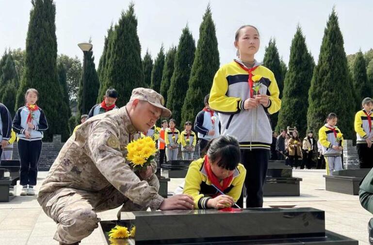 “一塊塊墓碑前,學(xué)生們?yōu)楸系淖置杞穑⒆屑?xì)擦拭。”帶領(lǐng)學(xué)生參加祭掃活動(dòng)的周老師表示,學(xué)生們還通過(guò)“我為烈士留下悄悄話小語(yǔ)貼”活動(dòng),隔空與烈士們“對(duì)話”,站在墓前,了解烈士背后的英勇事跡。